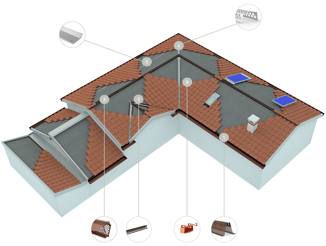 Grazie a tutti gli elementi che collaborano tra loro per la buona posa del manto, il sistema si presenta come una soluzione efficace e vincente. L’elemento di ancoraggio è la griglia di partenza, appositamente sagomata, alla quale, tramite ganci, si fissano tutte le file di coppi e embrici, rialzati ed appoggiati grazie al Piedino, fino alla griglia del colmo. Il sistema comprende tutti gli elementi necessari alla posa di un tetto ventilato con la possibilità di adattare ogni elemento alle esigenze del progetto.